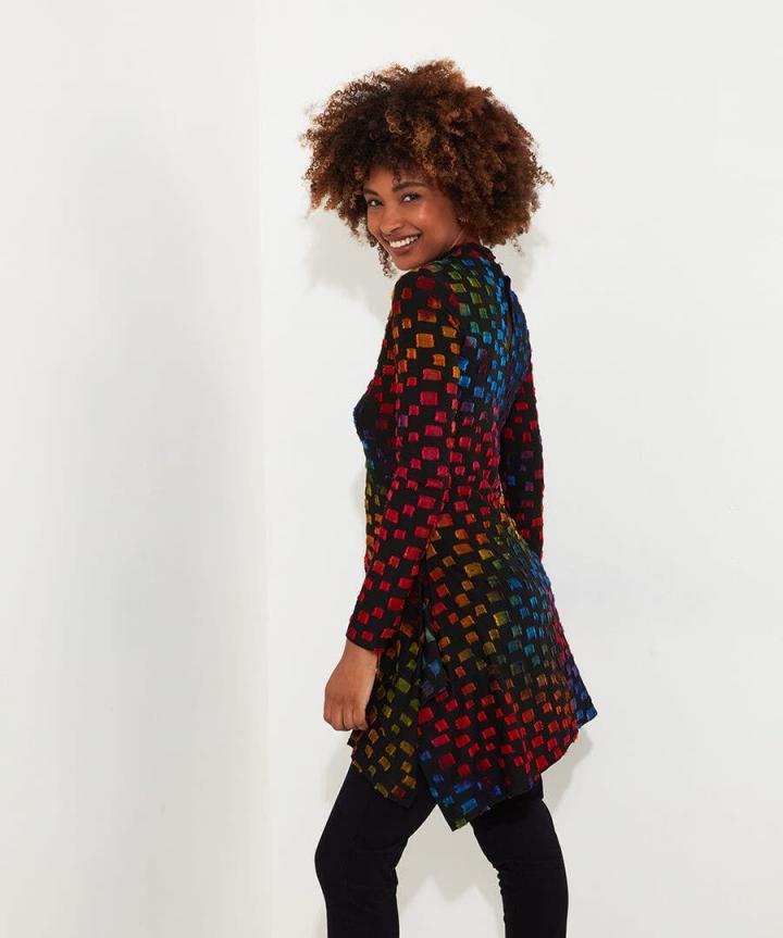 Pops of colour and textured fabric make this tunic the must have style of the season. Packed with plenty of delicate details in the twisted collarkeyhole neck and handkerchief hemyou’ll instantly stand out from the rest. Create a stunning silhouette by pairing it with jeans and heels for your next night out.Statement tunic Pops of colour in the print Unique twisted collar Keyhole detail at the neck Flattering handkerchief hem Made from textured fabric Approx Length. 85 cm